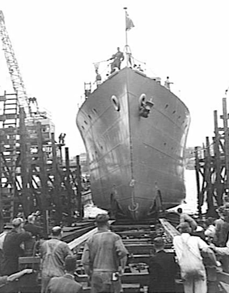 HMIS Bombay, J249, was named for a city in western India, now called Mumbai. She was built by Mort’s Dock and Engineering Co Ltd, laid down on 19 July 1941, launched 6 December 1941 and commissioned on 24 April 1942.