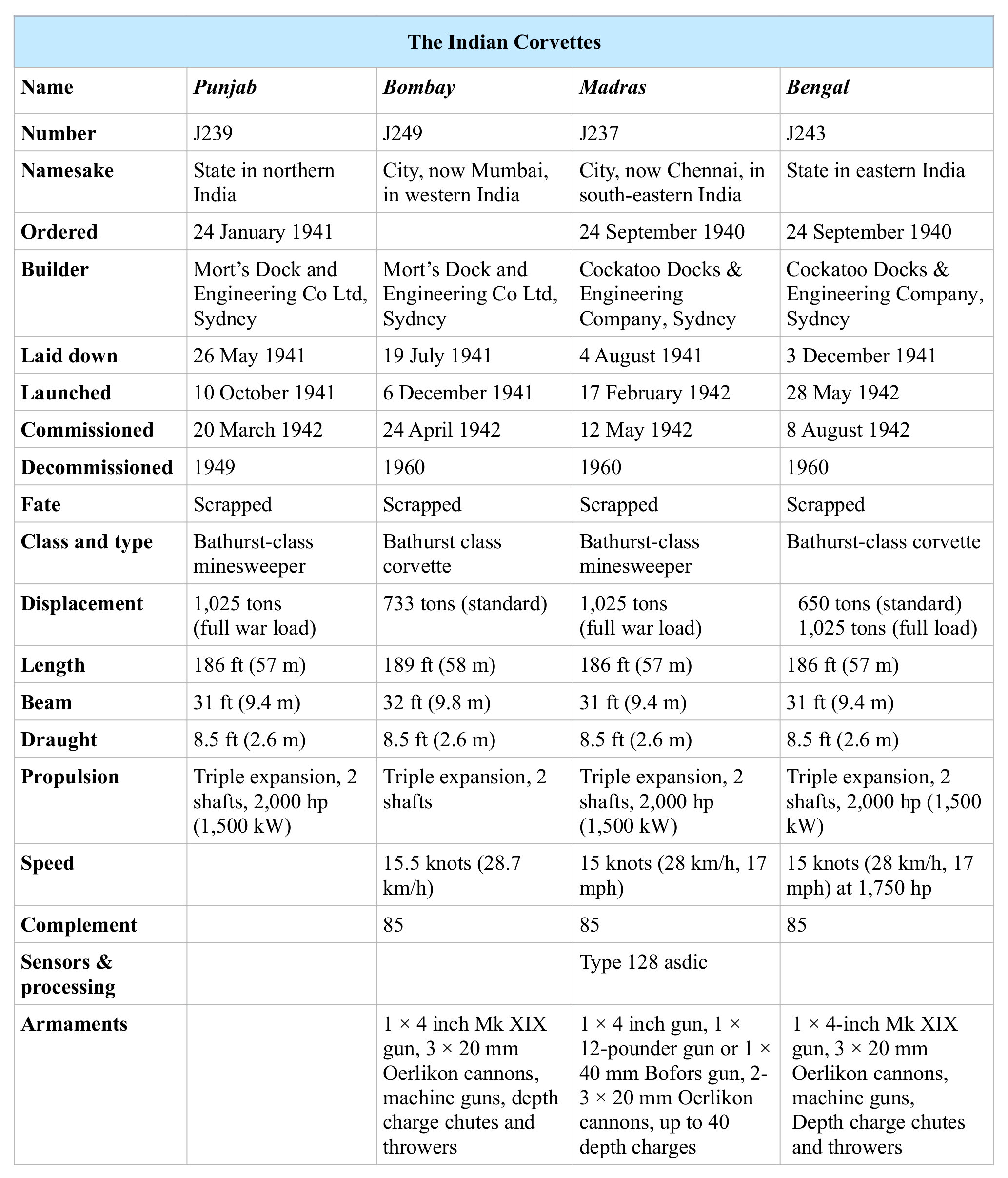 Of the sixty corvettes that were built in Australian yards, four were ordered for the Royal Indian Navy (RIN). We know some of the history of the fifty-six corvettes that served with the RAN, but very little is known about the four Indian vessels, named His Majesty's Indian Ships (HMIS) Punjab, Bombay, Madras and Bengal.
