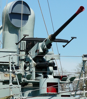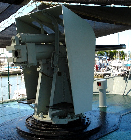 Mounted on the stern of HMAS Castlemaine is a single 40mm Swedish designed Bofors gun. The 40mm Bofors is credited with being the most effective anti-aircraft gun used I World War II. The mounting on HMAS Castlemaine is a QF 40mm Mark V which had a range of 9,700 yards (8,870 m) and could reach an altitude of 22,800ft (6,950m) at a rate of 160 rounds per minute. Under battle conditions a rate of fire of 100 rounds per minute would be difficult to achieve. A stern mounted Bofors replaced the single Oerlikon mounted in the same position in 1944.