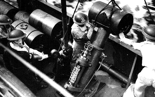 The simplest way to deploy a depth charge was to drop it over the stern. HMAS Castlemaine’s stern racks each held three depth charges. A depth charge thrower, which was capable to throwing a depth charge a short distance (60 yards/54 metres) from the side of the ship, was fitted on each beam. By using the racks and throwers together, the pattern of depth charges dropped from the ship would cover a greater area and thus improve the chances of a successful attack.