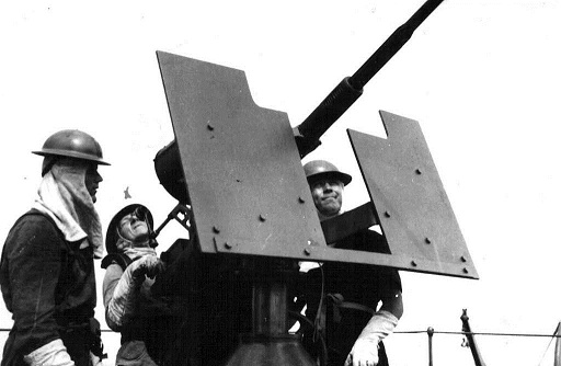 A Swiss designed single barrel 20mm Oerlikon light anti-aircraft gun was mounted on each side of the bridge, covering the bow, stern and side on which they were mounted and another single Oerlikon mount on the stern. The Oerlikon was the most prolific weapon fitted to ships in World War II. About 55,000 were fitted to Royal and Commonwealth Navy vessels.