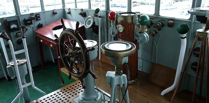 The main feature of the bridge is the restored helm, a spoked steering wheel which the helmsman would turn to alter the direction in which the ship is moving. This wheel has a mid-ships spoke marked with a knotted rope or similar protuberance so that it may be found in the dark. Starting with this at 12 o'clock and the ship steering dead ahead the sailor could determine how much turn he had put on the wheel. There is also a large double wheel, located in the tiller flat or steering compartment, near the rudder, which could be used to alter the course if the bridge was damaged or a linkage broke between the helm and the steering compartment.