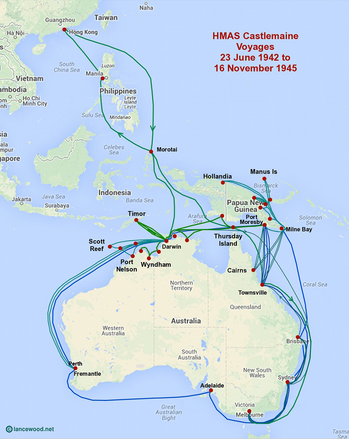 See Gallery for images of life on HMAS Castlemaine, and more wartime maps and activities in War History. Click map for larger version.